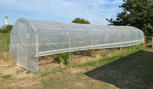 Suite à mon dernier mail, voici les photos de mon installation. La serre repose sur des "bordures de jardin" posées à plat. Ainsi l'eau de pluie n'éclabousse pas la bâche plastique de la serre. J'ai également des bordures de jardin mais posées à champ à l'intérieur de la serre afin d'éviter que la terre soit en contact avec le plastique de la serre.